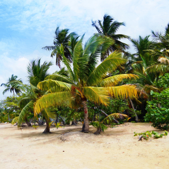 Honeymoon Beach is a pretty, white sand beach. The shore is lined with palm trees. Small palm frond umbrella huts offer shade and there is a shed on the beach. The beach is typically surf free and deepens gradually so is perfect for small children. The crystal clear water is inviting and offers fair snorkeling. The beach is usually sparsely populated on weekdays except for a couple hours in the afternoon when a boat charter stops in.